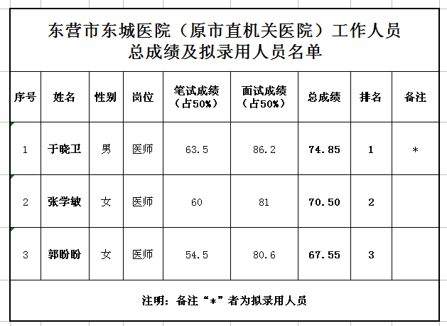 根據(jù)本次招聘活動的安排,現(xiàn)將東營市東城醫(yī)院(原市直機關(guān)醫(yī)院)招聘工作人員的總成績及擬錄用人員名單予以公布。望擬錄用人員按照統(tǒng)一規(guī)定和要求辦理相關(guān)手續(xù)。